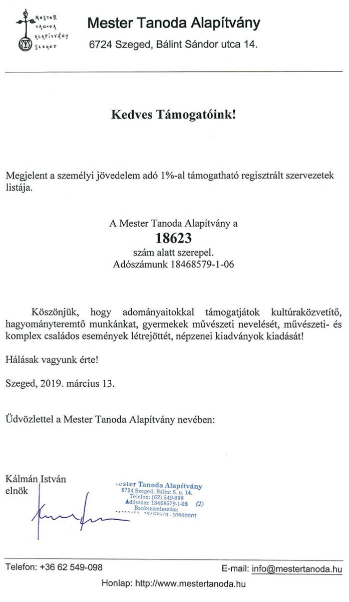 Köszönjük a Mester Tanoda Alapítvány tevékenységének eddigi támogatását és egyben kérjük, hogy adója 1%-val segítse további terveink megvalósulását!