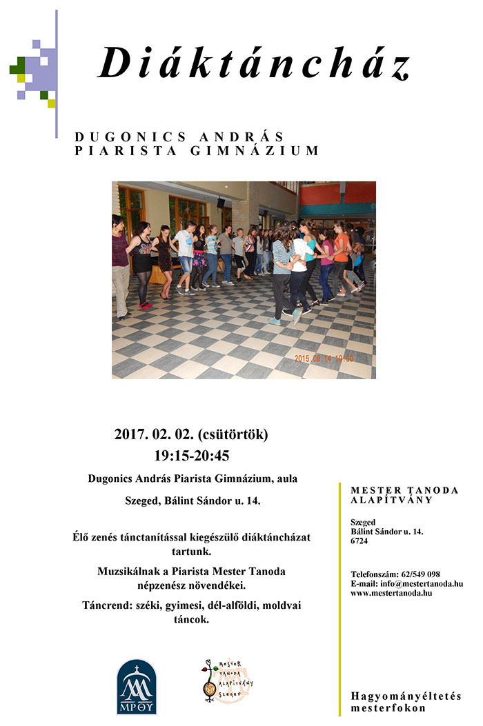 2017. február 2-án élő zenés tánctanítással kiegészülő diáktáncházat tartottunk. Muzsikáltak a DAPG Alapfokú Művészeti Iskola népzenész növendékei. Széki, gyimesi, dél-alföldi, moldvai táncokat táncoltak.