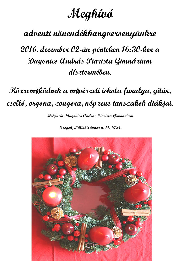 2016. december 12-17. között immáron negyedik alkalommal találkozott a Cambridge-i St Catharine’s College és a szegedi Dugonics András Piarista Gimnázium Népzenei Kamaraműhelye, hogy közös zenei műhelymunkából születő koncert műsorral gyönyörködtessék nagyérdemű közönséget.