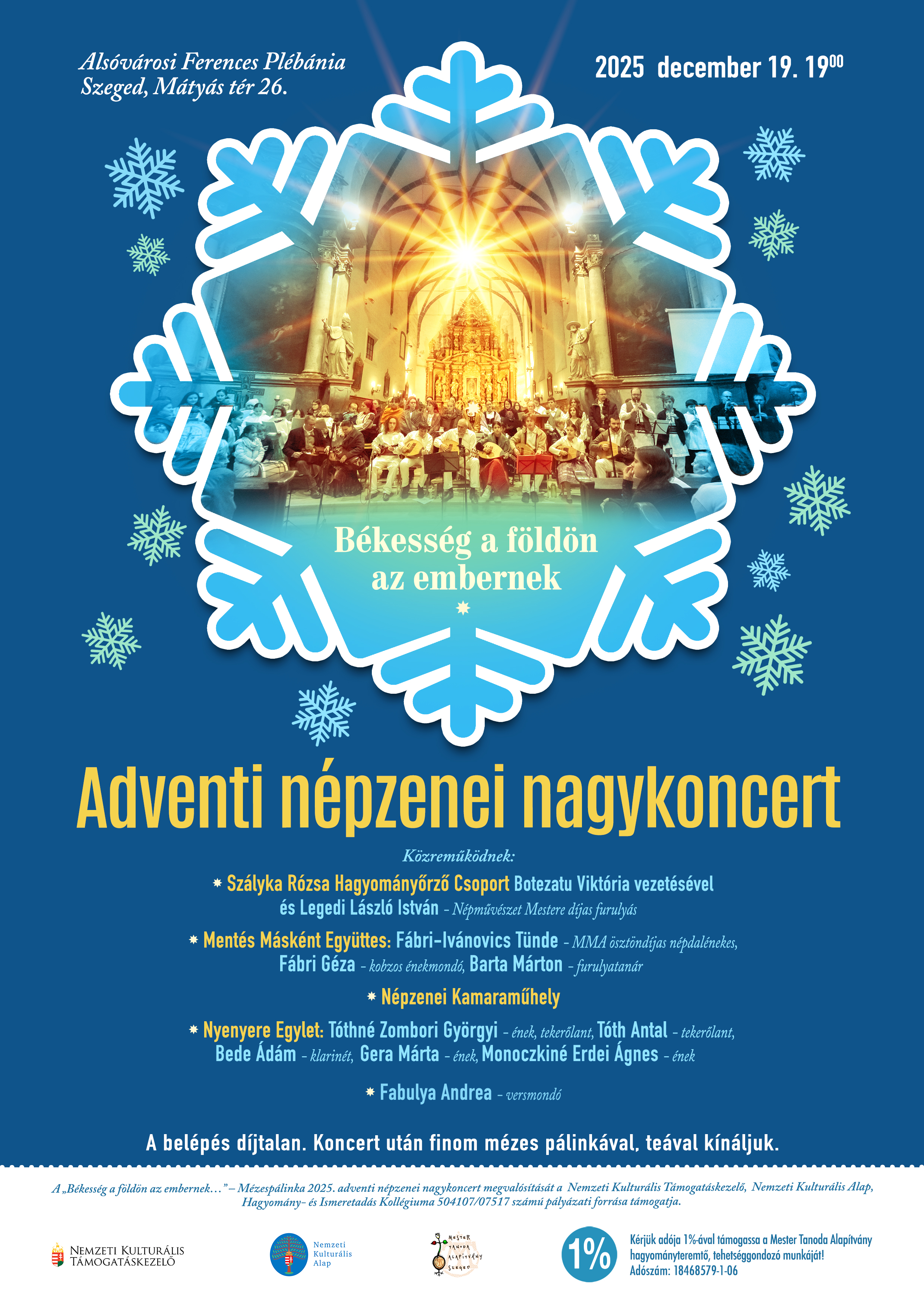 Idén immár huszadik éve kerül sor a Békesség a földön az embernek… - Mézespálinka adventi népzenei nagykoncertre, amelyet a szegedi Alsóvárosi Ferences Plébánia (6725 Szeged, Mátyás tér 26. 2025.) templomában tartunk december 19-én 19:00 órakor.